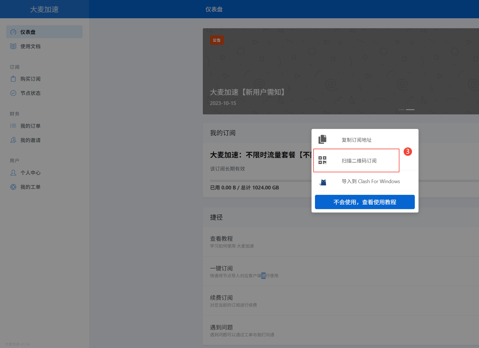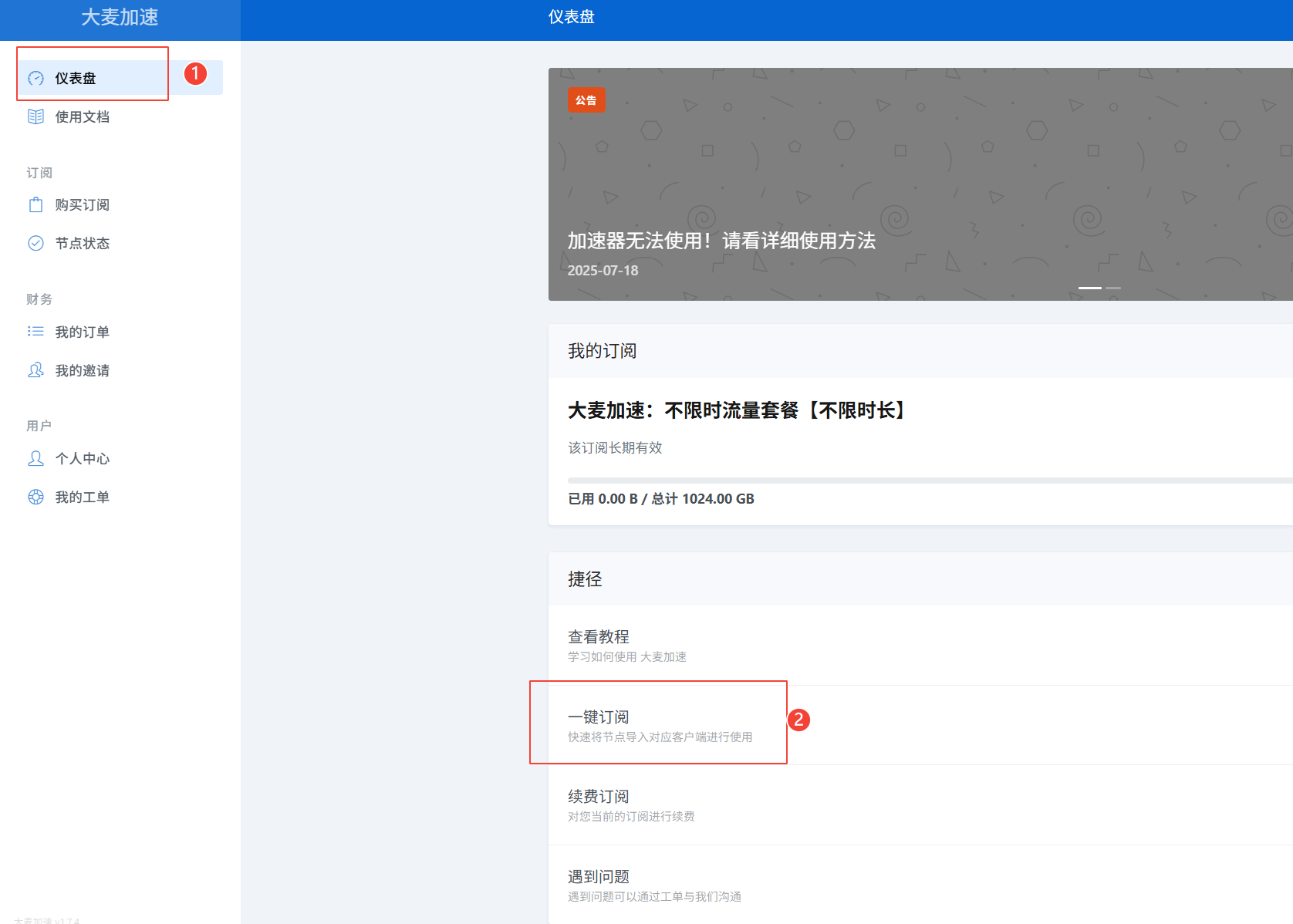 > ## 免责声明 > 请遵守法律法规,本网站所提供的信息,只供学习参考之用。严禁用作其他用途,您需对自己的自主行为和决定负责。 凡以任何方式登录本网站或直接、间接使用本网站资料者,视为自愿接受本网站声明的约束。。 ## 第一步、打开大麦云官网注册账号购买订阅套餐(已购买套餐看第二步教程) <div class="mrdoc-fragment" data-fragid=47>[片段]大麦官网</div> ### 1.注册大麦云加速账号  ## 第二步、下载v2ray电脑端软件 ## [👉 点我下载PC v2ray软件👈](https://app.liulianglm.cc/pcv2-Core.zip) ## 第三步、打开下载好的软件压缩包,解压到C盘或桌面  ### 1.鼠标右键发送快捷方式到桌面  ### 2.双击打开V2ray软件  ### 3.点击设置---参数设置---跳过证书验证   ## 第四步、打开大麦云加速官网导入线路 ### 1.登录账号 <div class="mrdoc-fragment" data-fragid=47>[片段]大麦官网</div>  ### 2.点击 仪表盘, 点击一键订阅  ### 3.扫描二维码订阅  ### 4.停留在这个二维码页面,再打开v2rayN软件扫描导入  ## 第五步、回到v2软件,点击(服务器),点击扫描屏幕上的二维码   ### 2.点击(订阅),点击更新订阅  ## 3.(全选线路Ctrl键+A)--全部测速(Ctrl键+R)  ### 4.鼠标点击要连接的线路,按回车键(enter)选中当前线路,(选择有连接数值的线路)  ### 4.在电脑右下角软件v2ray中,鼠标右键,点击系统代理,自动配置系统代理(开启加速),任务栏图标变成红色的,即代表已成功联网  ## 开启加速就可以访问外网了 > ## 软件开启关闭 > ### 开启:系统代理--自动配置系统代理 > ### 关闭:系统代理--清除系统代理 ## <a href="../../doc/2537/" targert="_blank">👉返回加速器使用首页</a>